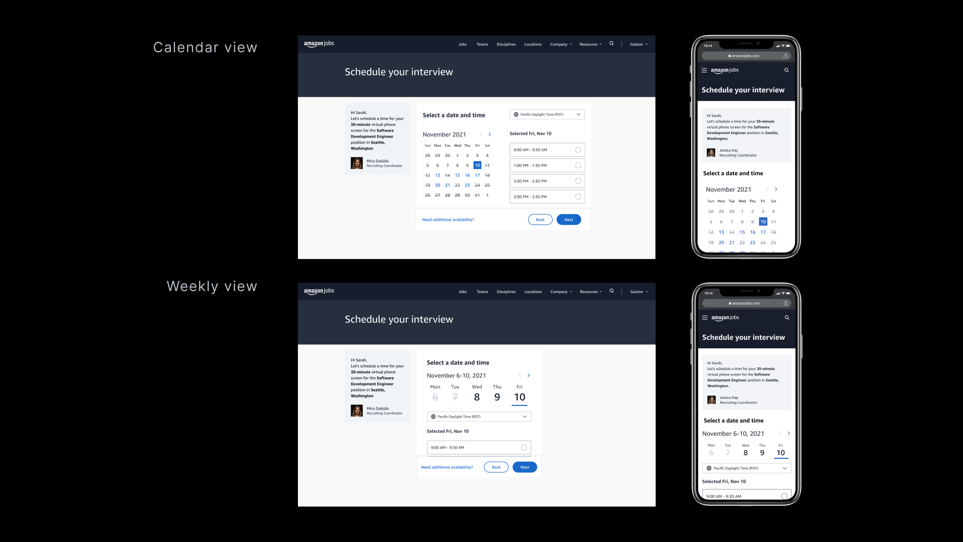 It was still up in the air how many slots candidates would be shown to choose from. To make sure my designs would support realistic use cases, I relied on knowledge from recruiting coordinators on how they were currently scheduling interviews to base my designs off of
