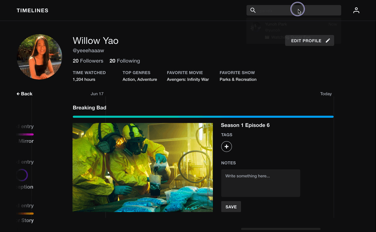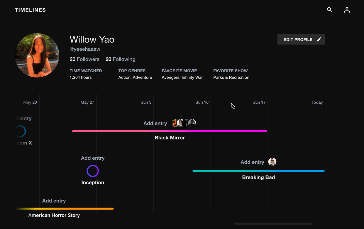 We then iterated on the concept of creating journal entries for shows. After drawing inspiration from Spotify Wrapped, we eventually landed on the idea of using a timeline to visually represent people’s watch history.